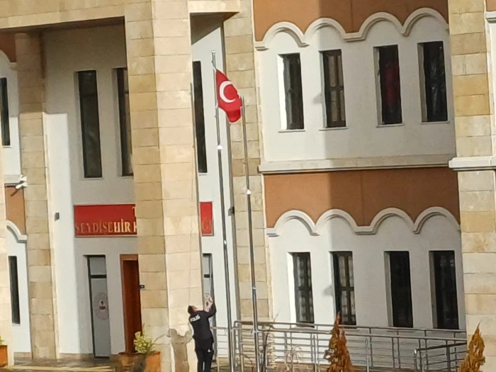 Konya’nın Seydişehir ilçesinde, Sarı kotla etkili olan fırtına uyarısının ardından şiddetli rüzgâr nedeniyle Seydişehir Kaymakamlığı binası önünde bulunan Türk bayrağı direkte aşağıya indi.