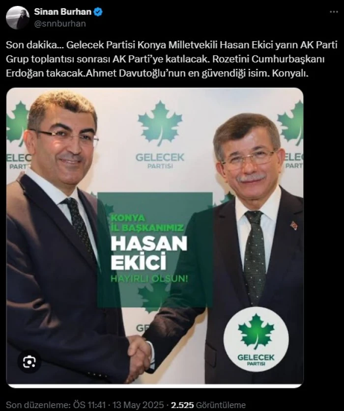 Burhan paylaşımında, "Gelecek Partisi Konya Milletvekili Hasan Ekici yarın AK Parti Grup toplantısı sonrası AK Parti’ye katılacak. Rozetini Cumhurbaşkanı Erdoğan takacak.Ahmet Davutoğlu’nun en güvendiği isim. Konyalı." notunu düştü.