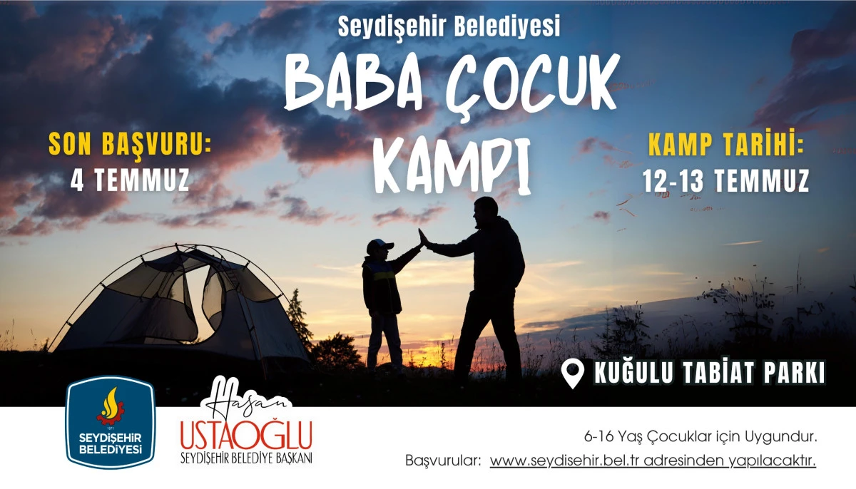 Seydişehir Belediyesi organizasyonu ile küçük yaşta çocuklara doğa sevgisini aşılamak ve farklı kuşakların birbirlerine deneyimlerine aktarmaları adına gerçekleştirdiği baba-çocuk kamp etkinliklerine 6-16 Yaş arası çocuklar ve babaları katılabilecek.