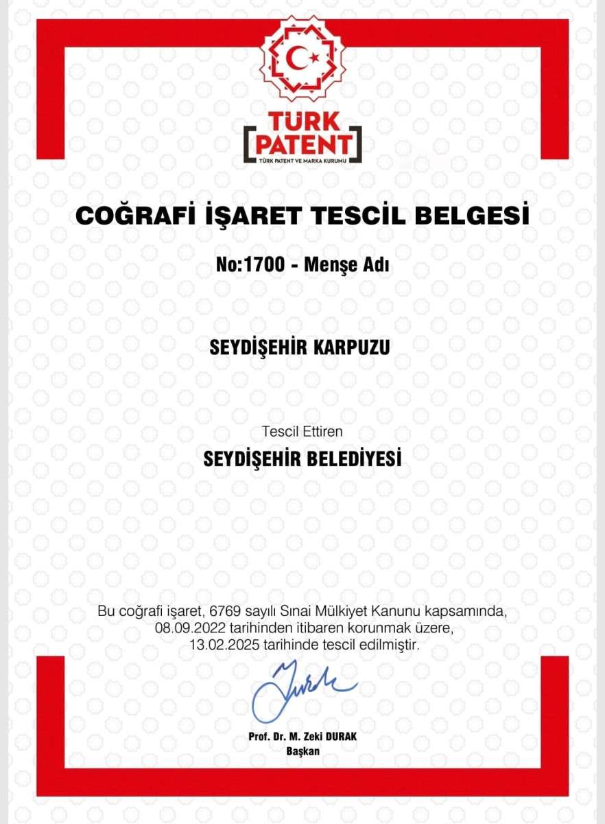 Seydişehir Karpuzunun Coğrafi İşaret Tescil Belgesini Türk Patent ve Marka Kurumu Başkanlığı tarafından tescillendiğini kaydeden Belediye Başkanı Hasan Ustaoğlu; “Seydişehir’in sahip olduğu değerlerin tanıtımını sağlamak ve markalaştırmak hedefiyle çalışmalarımızı aralıksız sürdürüyoruz" ifadesini kullandı.