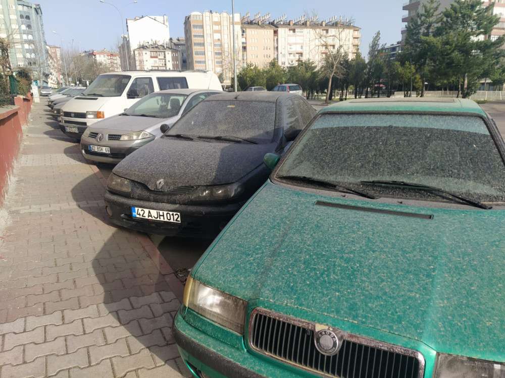 Meteoroloji verilerine göre bu gün saatte 27 km bulan kum fırtınası nedeniyle çiçek açan ağaçlar çiçeklerini dökerken araçlar çamur oldu.