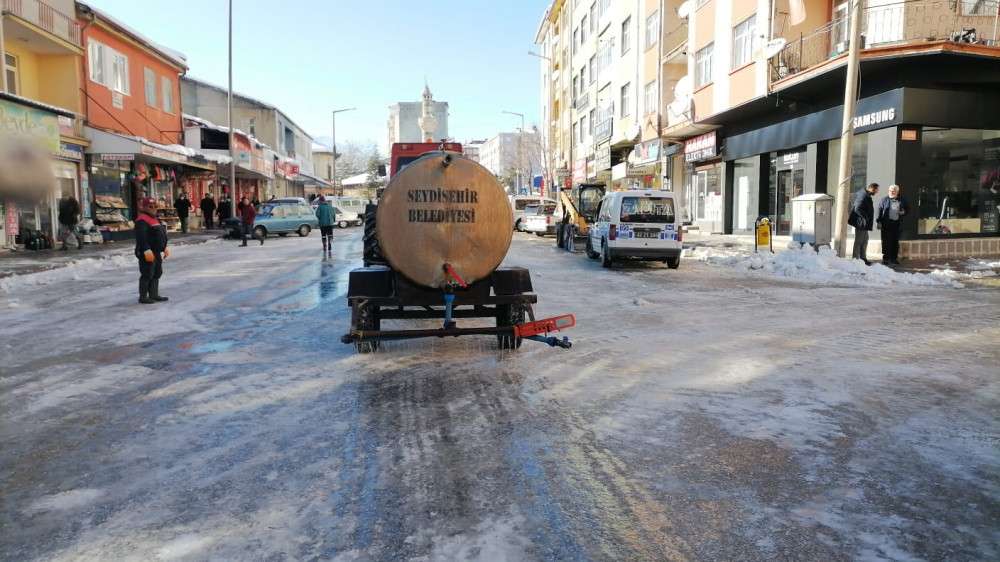 Seydişehir'de etkili olan kar yağışının ardından ekipler tarafından başlatılan karla mücadele çalışması tüm hızıyla devam ederken, ana arter caddelerde ekipler buzlanmaya karşı solüsyon çalışması gerçekleştirmeye devam ediyor.