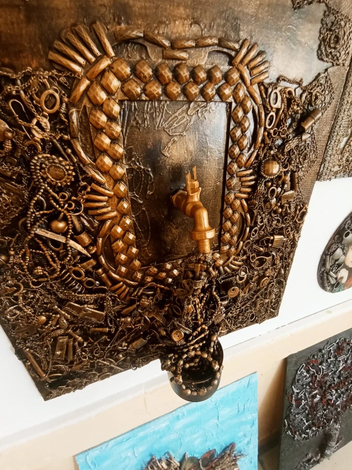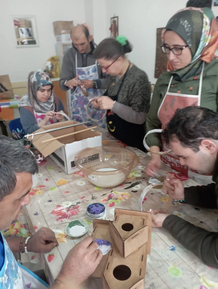 Halk Eğitim Merkezi bünyesinde açılan kurs kapsamında yaşları 19 ila 39 arasında olan 14 engelli öğrenci doğada buldukları atıkları boyayarak tablo ,süs eşyası ve takı haline getiriyor.