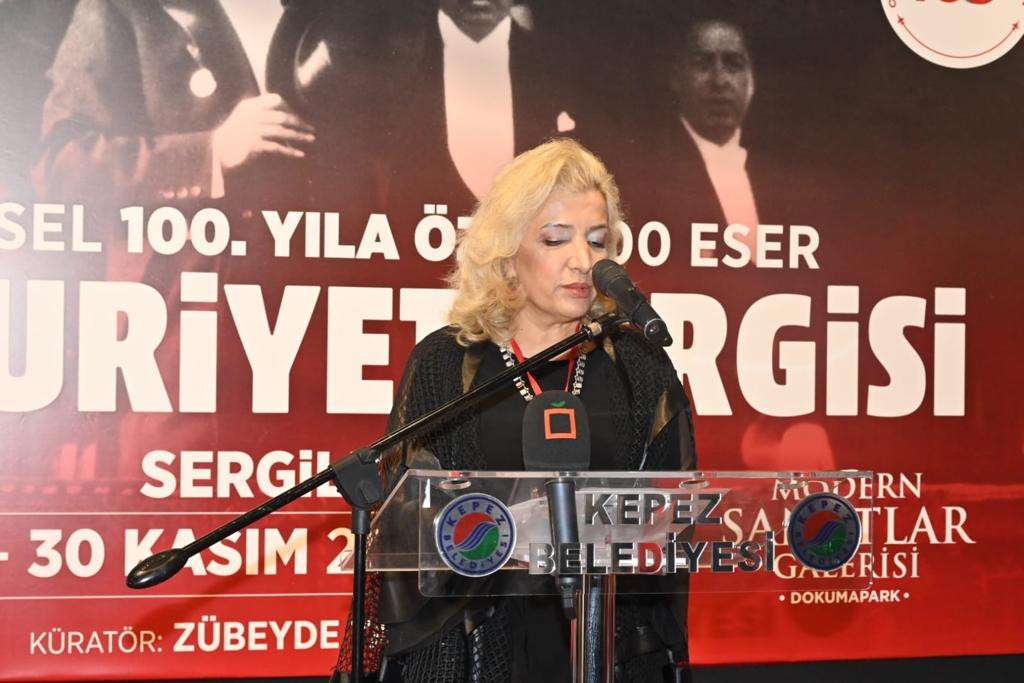 Bugün ne mutlu ki bizlere başından bu yana kepez belediyesi himayedarlığında , 9. Sunu düzenlediğimiz geleneksel 100 .yıla özel 100 eser Cumhuriyet sergisi ile 100. Yılı kutlamak için buradayız.